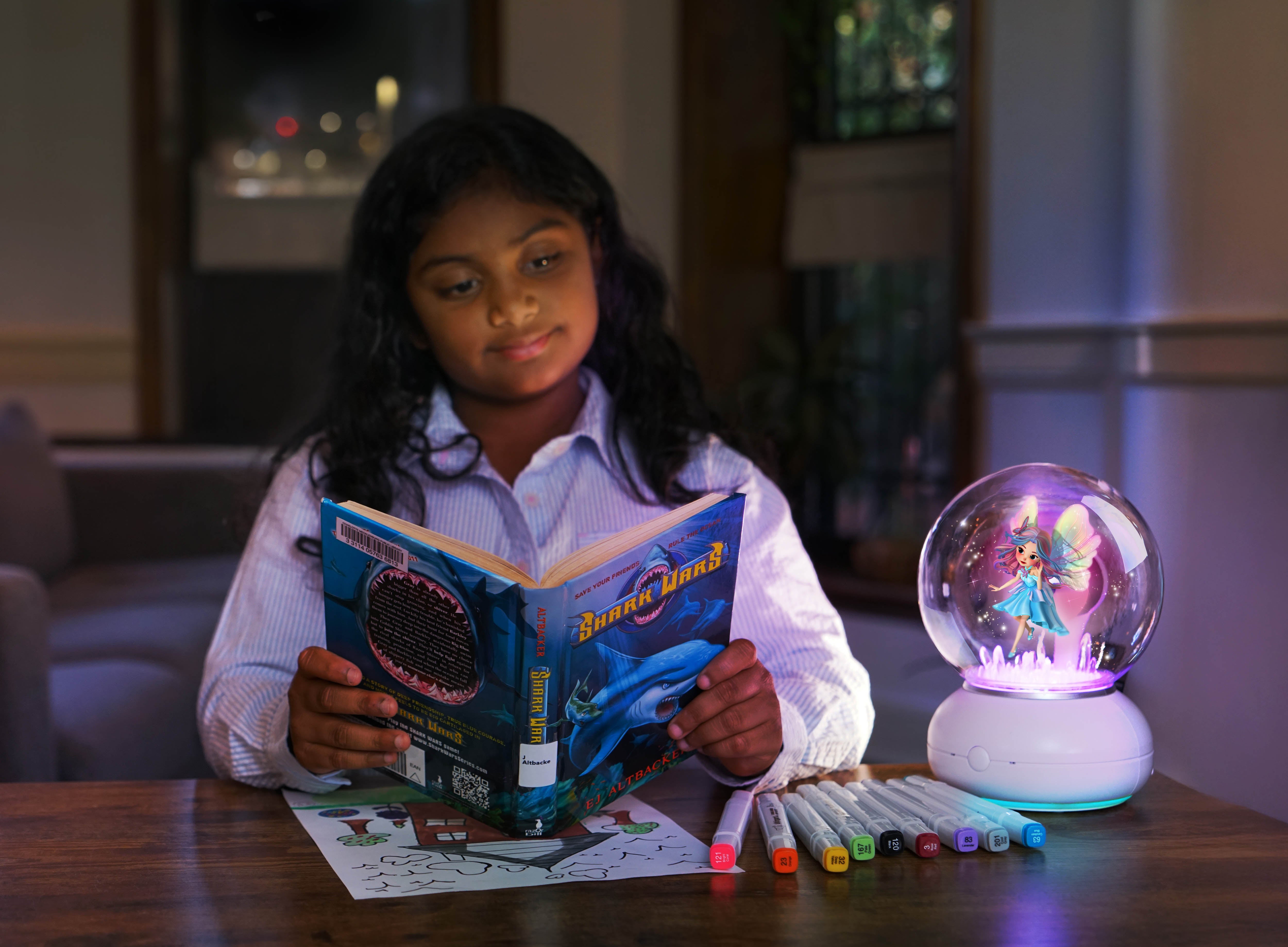 A built-in full-range speaker fills the space with clear voices, soft ambient music, and magical sound effects that sync perfectly with each animation.